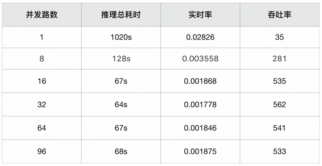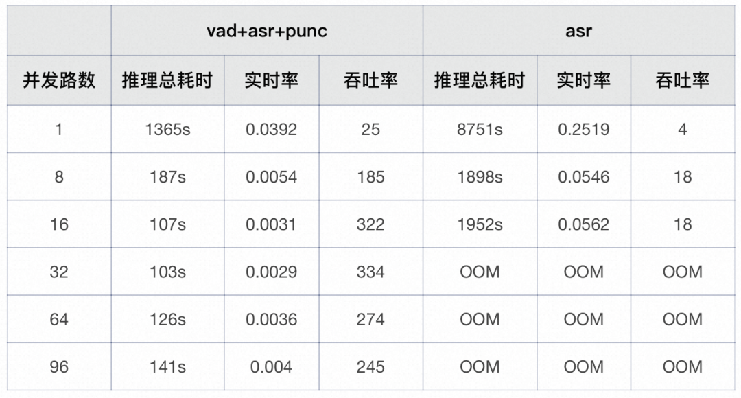 在一个长音频测试集上(时长为0~24min)分别对asr链路、vad+asr+punc链路进行了测试,asr链路在并发32线时会OOM,vad+asr+punc链路的吞吐率为334,相比asr链路有明显优势。不同配置下的详细吞吐率指标如下表: