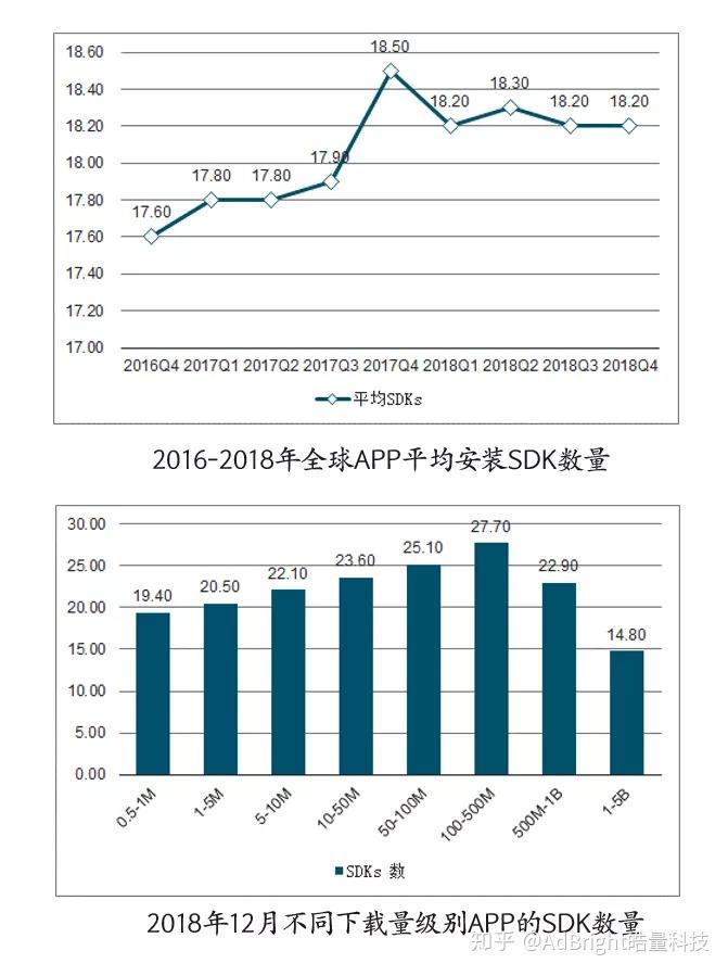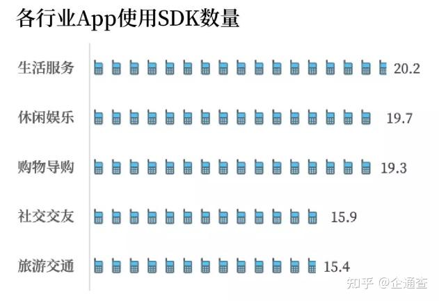SDK(Software Development Kit),是集成在应用程序(“App”)里的第三方工具包,为什么说SDK服务商低调,是因为其不是应用程序运营者,只是在应用程序中提供了某项功能,如地图、支付、统计、社交、广告等,从消费者感知的角度,存在感比较弱。据统计[iii],平均每款App会使用19.3个SDK,而微信SDK、腾讯Open SDK、小米推送SDK、华为SDK、支付宝SDK等被超过半数的App嵌入。