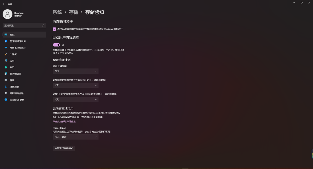 将【运行存储感知】设置为每天,【回收站】及【下载】设置为【一天】即可。