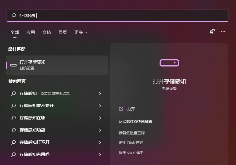 直接搜索【存储感知】,也可在【设置】中,选择【系统】,选择【存储】找到。