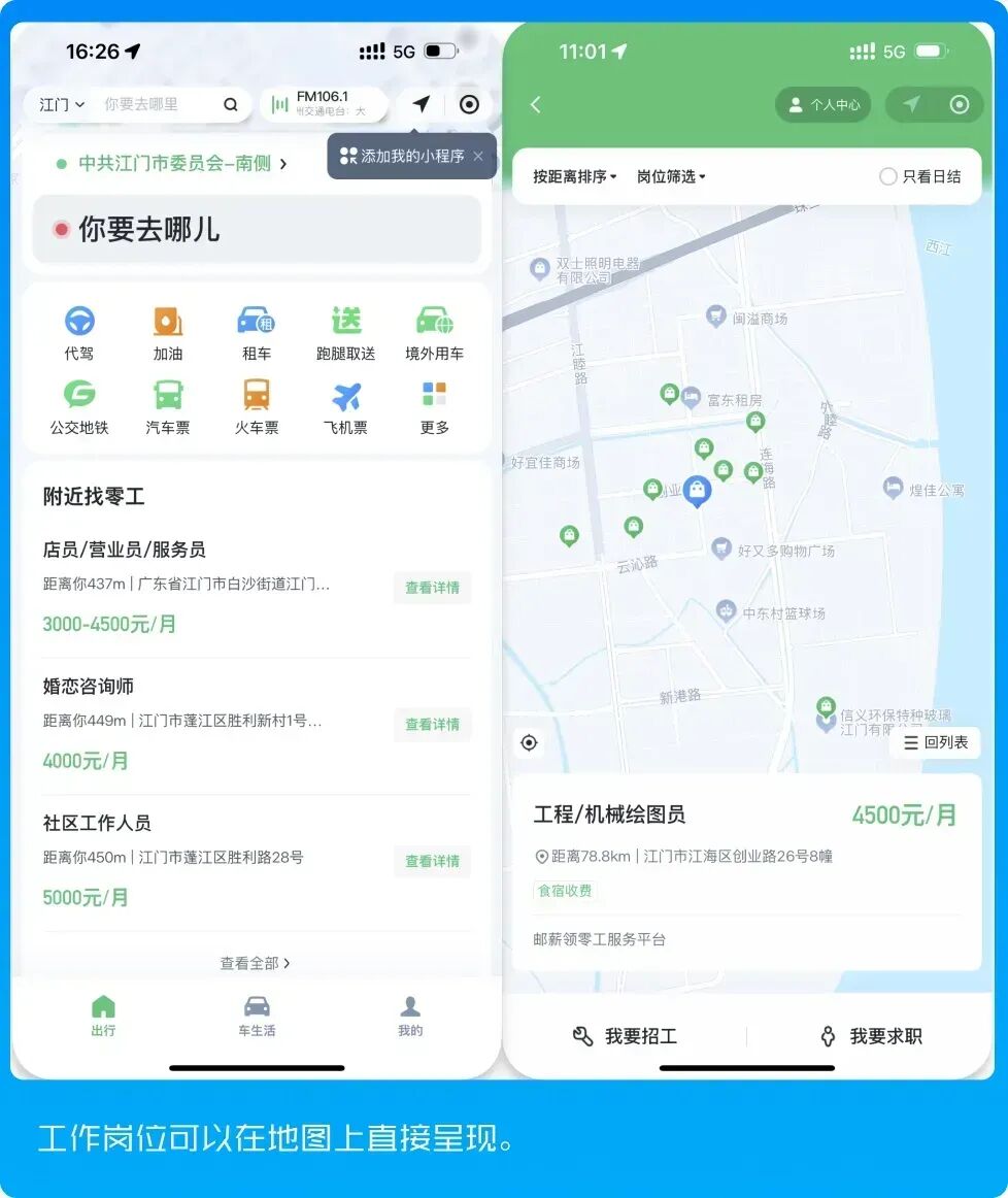 方法二:或者将手机定位江门,然后打开 微信,点击“我”-“服务”-“出行服务”,向下滑动,就可以进入【零工市场】,查看距离你最近的工作机会。