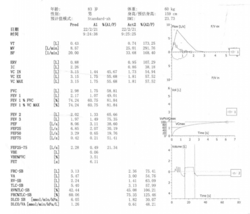 肺功能诊断:重度混合性通气功能障碍;一氧化碳弥散量重度降低。