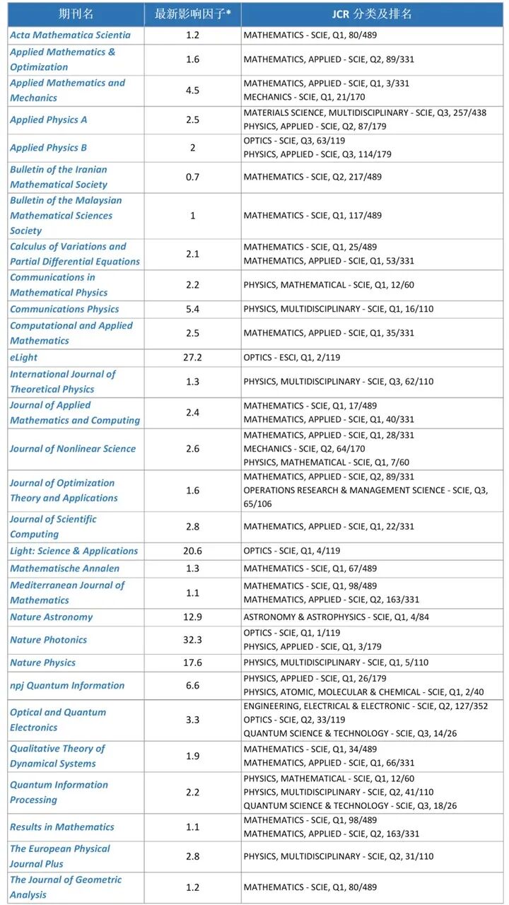 在此,我们梳理了最新的精选期刊及其相关指标,涵盖数学及物理领域的众多主题。这些期刊呈现了优秀的研究成果,激发了学术探讨,为科研人员构建了重要的信息来源与交流平台。