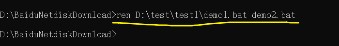 下面3张图,就是演示如何直接用命令【ren D: est est1demo1.bat demo2.bat】,把处于目录【D: est est1】下的demo.bat文件重命名成demo2.bat的。