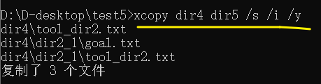 我们需要将这个目录复制到dir5目录下,并且包括子目录下的文件,执行命令【xcopy dir4 dir5 /s /i /y】。