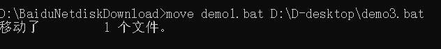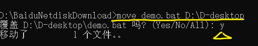 如果我想要将【D:BaiduNetdiskDownload】目录下的文件移动到【D:D-desktop】目录,我可以执行以下命令【move demo.bat D:D-desktop】,然后cmd窗口中提示是否覆盖,我再执行y,就移动并覆盖成功了。