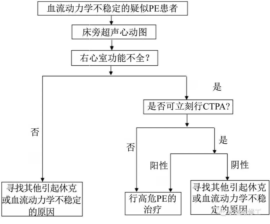 (1) 血流动力学不稳定的疑似PE诊断流程:对于血流动力学不稳定且评估为PE高度临床可能性的患者应迅速与心脏填塞、急性冠状动脉综合征(ACS)、主动脉夹层、急性瓣膜功能障碍,以及低血容量等进行鉴别。此时最有价值的检查是床旁超声心动图检查。如果患者同时伴有右心室功能障碍,可直接给予再灌注治疗,无需行进一步检查。否则需进行下一步检查,包括CTPA等,以明确诊断。见图1。