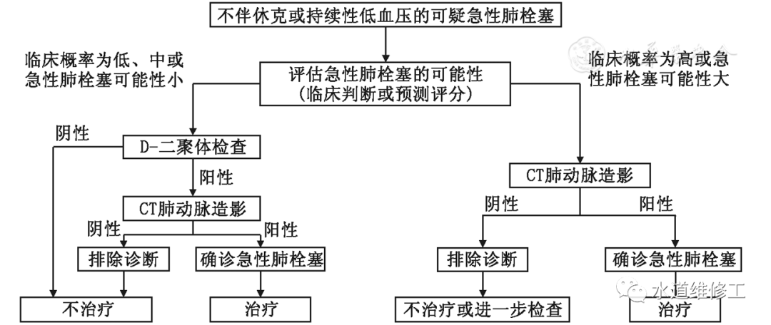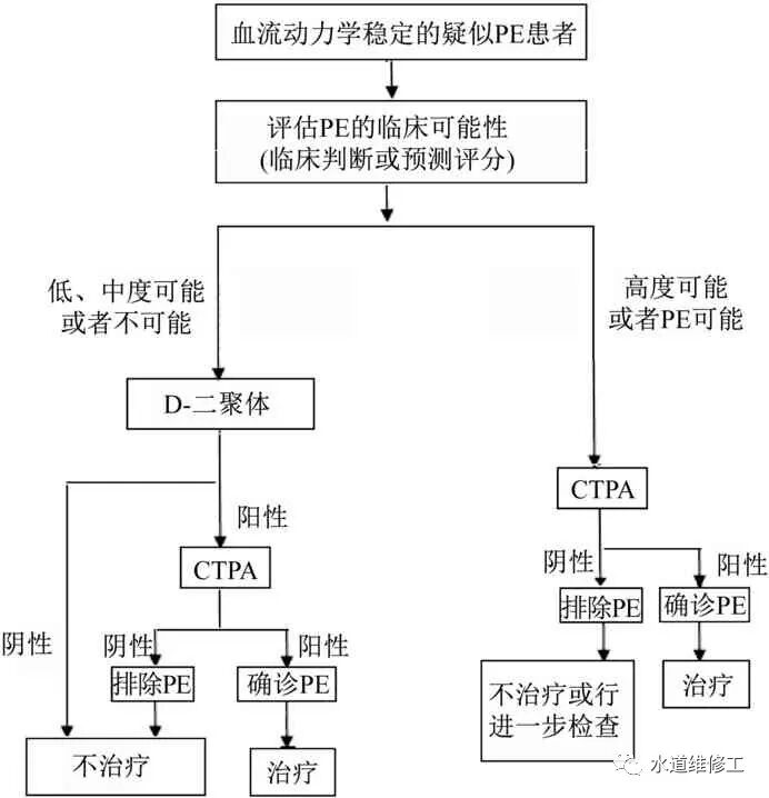3、实验室和影像学检测 临床可能性评估的结果结合D-二聚体、影像学检查可确诊PE。