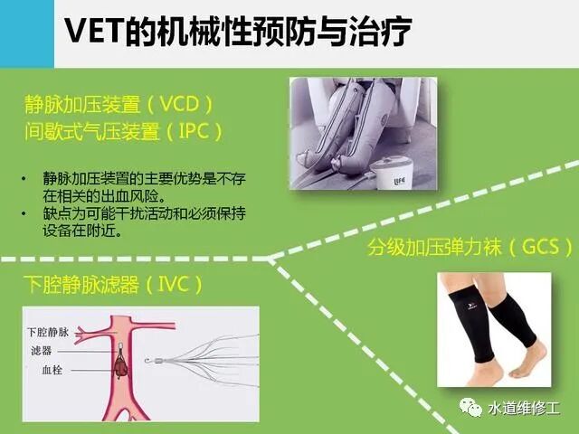 (1)机械性方法可减少部分患者发生DVT的危险,但疗效逊于抗凝药物,其最大优势在于没有出血并发症,但同时合并动脉供血不足患者应慎用GCS。目前,没有一种机械方法被证实能减少死亡或PE的危险。这些设备应尽可能在双腿应用,且一直持续到可以开始LMWH治疗。极高危患者单独应用疗效差,推荐与有效地抗凝治疗联合应用。