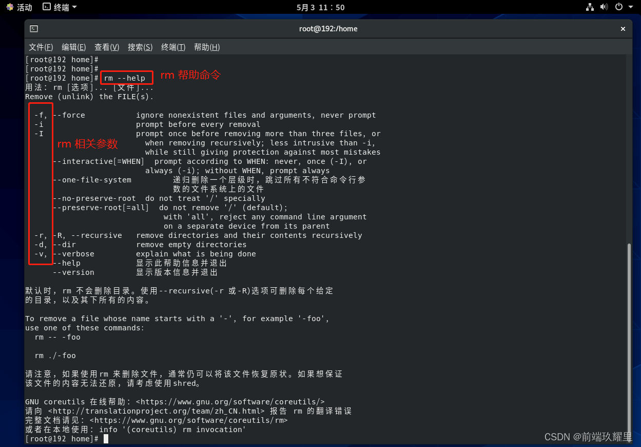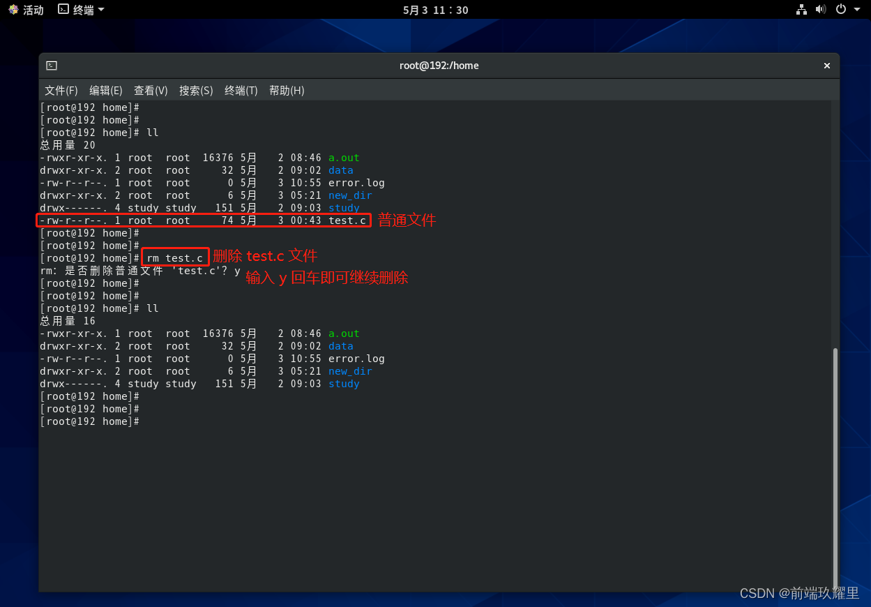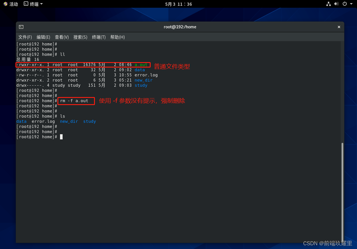 直接使用 命令删除文件的话会提示你一次是否确定删除文件。使用 可以不需要提示强制删除文件,以删除普通文件为例: