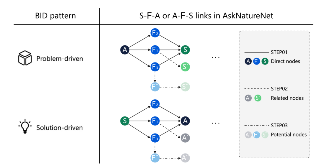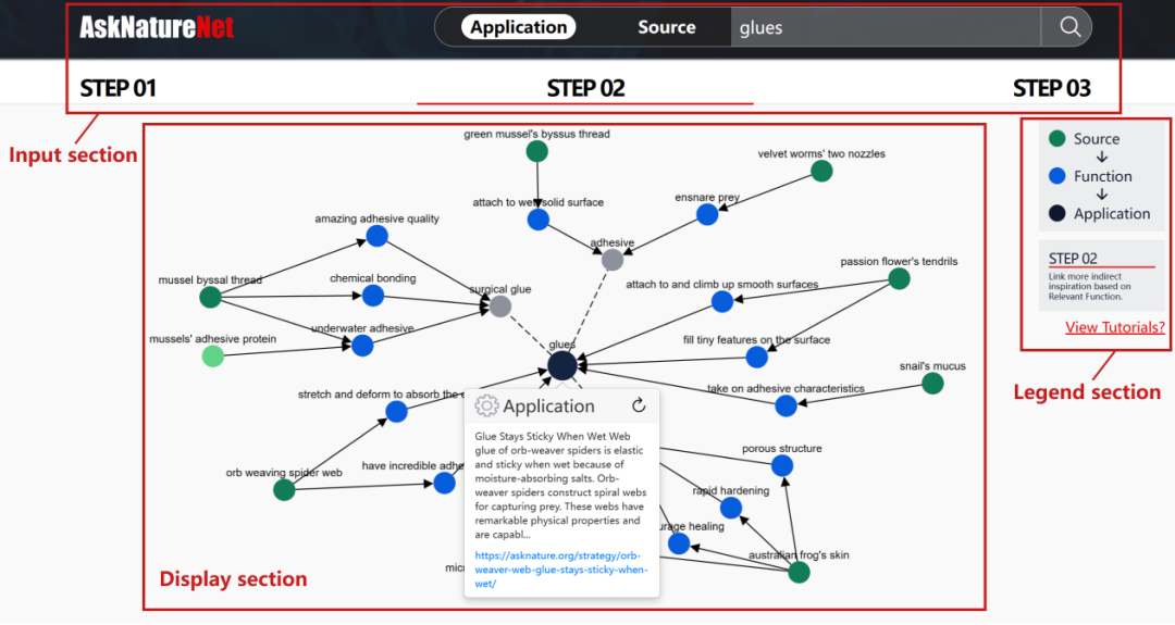 尽管现有的仿生设计数据库在收集和检索生物知识方面提供了便利,但在支持发散思维的应用中仍面临挑战。浙江大学设计学团队提出了AskNatureNet:一种基于仿生设计知识的发散思维工具,通过编码、检索和映射三个阶段来支持发散思维。该工具利用大语言模型,将生物知识编码为三元组形式,构建语义网络,以支持问题驱动和解决方案驱动的双向检索和映射。