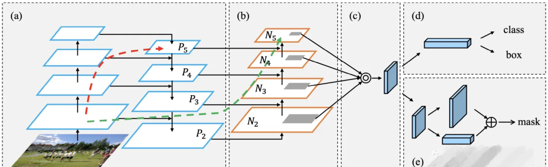 PANet[1]最大的贡献是提出了一个自顶向下和自底向上的双向融合骨干网络,同时在最底层和最高层之间添加了一条“short-cut”,用于缩短层之间的路径。PANet还提出了自适应特征池化(Adaptive Features Pooling)和全连接融合(Fully-connected Fusion)两个模块。其中自适应特征池化可以用于聚合不同层之间的特征,保证特征的完整性和多样性,而通过全连接融合可以得到更加准确的预测mask。