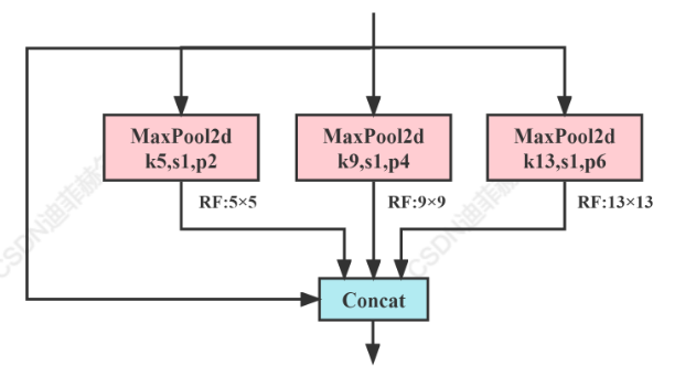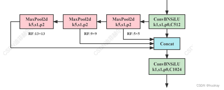 讯享网class SPP(nn.Module): # Spatial Pyramid Pooling (SPP) layer https://arxiv.org/abs/1406.4729 def title” style=“box-sizing: border-box;”>initparams” style=“box-sizing: border-box;”>(self, c1, c2, k=(5, 9, 13)): super().title” style=“box-sizing: border-box;”>initparams” style=“box-sizing: border-box;”>() c_ = c1 // 2 # hidden channels self.cv1 = Conv(c1, c_, 1, 1) self.cv2 = Conv(c_ * (len(k) + 1), c2, 1, 1) self.m = nn.ModuleList([nn.MaxPool2d(kernel_size=x, stride=1, padding=x // 2) for x in k]) def forward(self, x): x = self.cv1(x) with warnings.catch_warnings(): warnings.simplefilter(‘ignore’) return self.cv2(torch.cat([x] + [m(x) for m in self.m], 1))