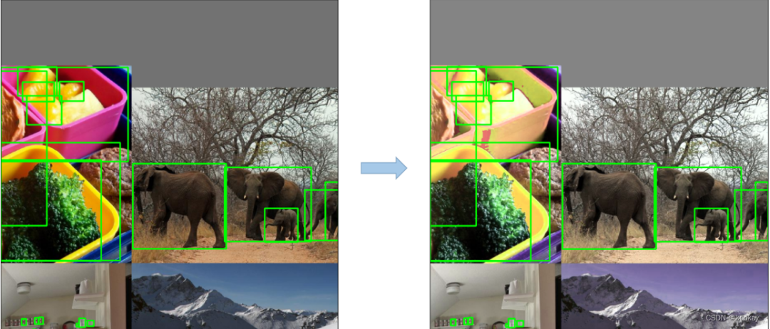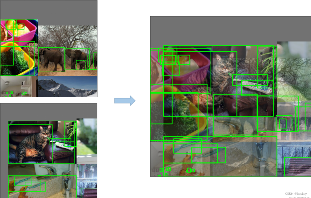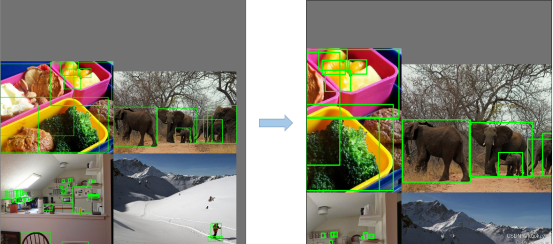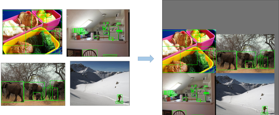 将四张图片拼成一张图片,采用随机缩放、随机裁剪、随机排布的方式进行拼接。