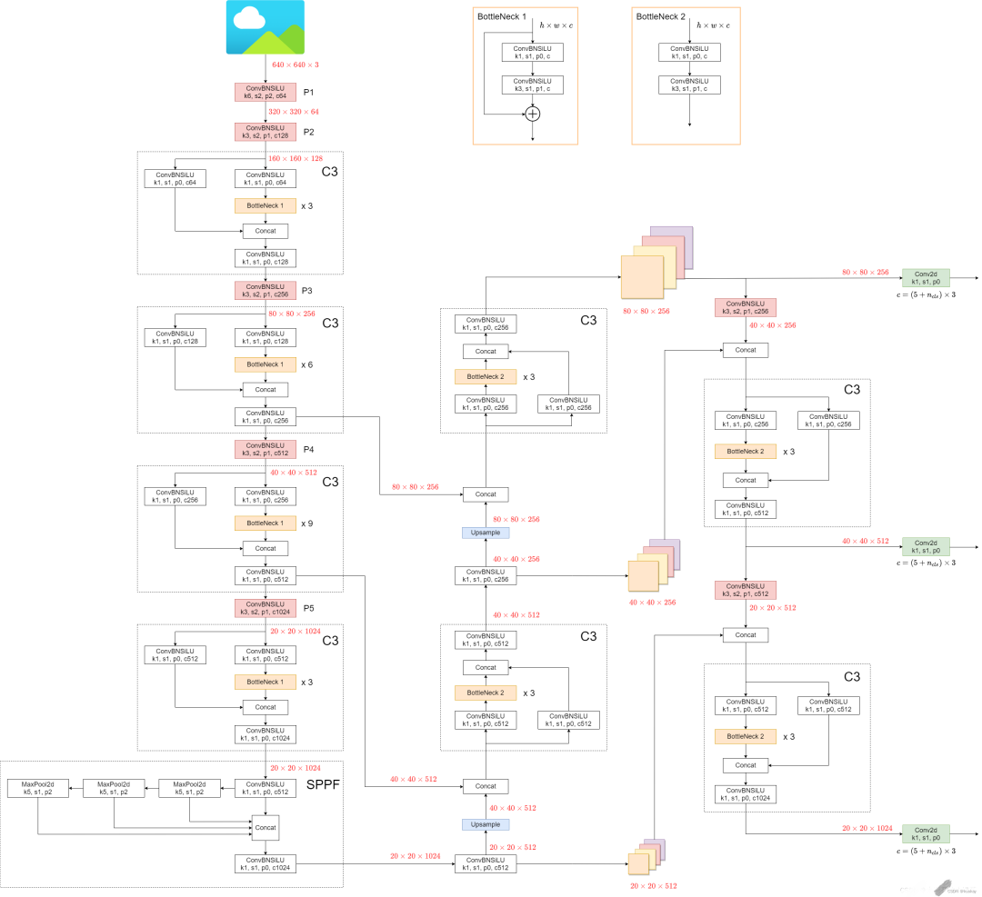 讯享网head: [[-1, 1, Conv, [512, 1, 1]], [-1, 1, nn.Upsample, [None, 2, ‘nearest’]], [[-1, 6], 1, Concat, [1]], [-1, 3, C3, [512, False]], # 13 [-1, 1, Conv, [256, 1, 1]], [-1, 1, nn.Upsample, [None, 2, ‘nearest’]], [[-1, 4], 1, Concat, [1]], [-1, 3, C3, [256, False]], # 17 (P3/8-small) [-1, 1, Conv, [256, 3, 2]], [[-1, 14], 1, Concat, [1]], [-1, 3, C3, [512, False]], # 20 (P4/16-medium) [-1, 1, Conv, [512, 3, 2]], [[-1, 10], 1, Concat, [1]], [-1, 3, C3, [1024, False]], # 23 (P5/32-large) [[17, 20, 23], 1, Detect, [nc, anchors]], # Detect(P3, P4, P5) ]