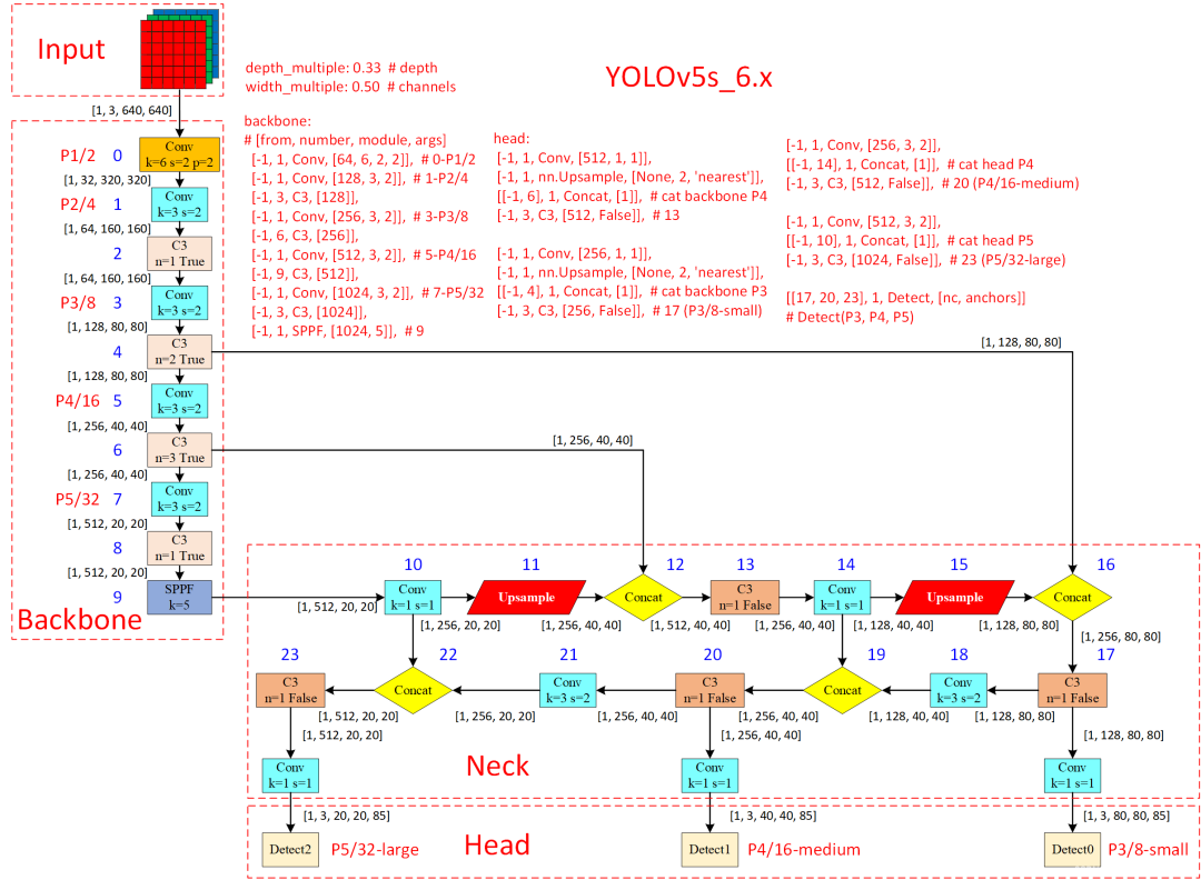 nc: 80 depth_multiple: 0.33 width_multiple: 0.50 # 如何理解这个depth_multiple和width_multiple呢?它决定的是整个模型中的深度(层数)和宽度(通道数。anchors: # 表示作用于当前特征图的Anchor大小为 xxx# 9个anchor,其中P表示特征图的层级,P3/8该层特征图缩放为1/8,是第3层特征 - [10,13, 16,30, 33,23] # P3/8, 表示[10,13],[16,30], [33,23]3个anchor - [30,61, 62,45, 59,119] # P4/16 - [116,90, 156,198, 373,326] # P5/32# YOLOv5s v6.0 backbonebackbone: # [from, number, module, args] [[-1, 1, Conv, [64, 6, 2, 2]], # 0-P1/2 [-1, 1, Conv, [128, 3, 2]], # 1-P2/4 [-1, 3, C3, [128]], [-1, 1, Conv, [256, 3, 2]], # 3-P3/8 [-1, 6, C3, [256]], [-1, 1, Conv, [512, 3, 2]], # 5-P4/16 [-1, 9, C3, [512]], [-1, 1, Conv, [1024, 3, 2]], # 7-P5/32 [-1, 3, C3, [1024]], [-1, 1, SPPF, [1024, 5]], # 9 ]# YOLOv5s v6.0 headhead: [[-1, 1, Conv, [512, 1, 1]], [-1, 1, nn.Upsample, [None, 2, ‘nearest’]], [[-1, 6], 1, Concat, [1]], [-1, 3, C3, [512, False]], # 13 [-1, 1, Conv, [256, 1, 1]], [-1, 1, nn.Upsample, [None, 2, ‘nearest’]], [[-1, 4], 1, Concat, [1]], [-1, 3, C3, [256, False]], # 17 (P3/8-small) [-1, 1, Conv, [256, 3, 2]], [[-1, 14], 1, Concat, [1]], [-1, 3, C3, [512, False]], # 20 (P4/16-medium) [-1, 1, Conv, [512, 3, 2]], [[-1, 10], 1, Concat, [1]], [-1, 3, C3, [1024, False]], # 23 (P5/32-large) [[17, 20, 23], 1, Detect, [nc, anchors]], # Detect(P3, P4, P5) ]