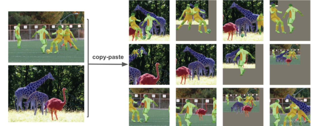 将部分目标随机的粘贴到图片中,前提是数据要有segments数据才行,即每个目标的实例分割信息。