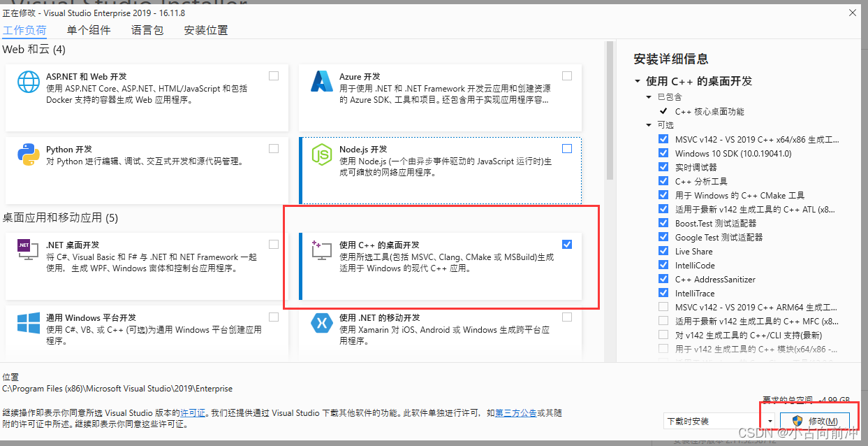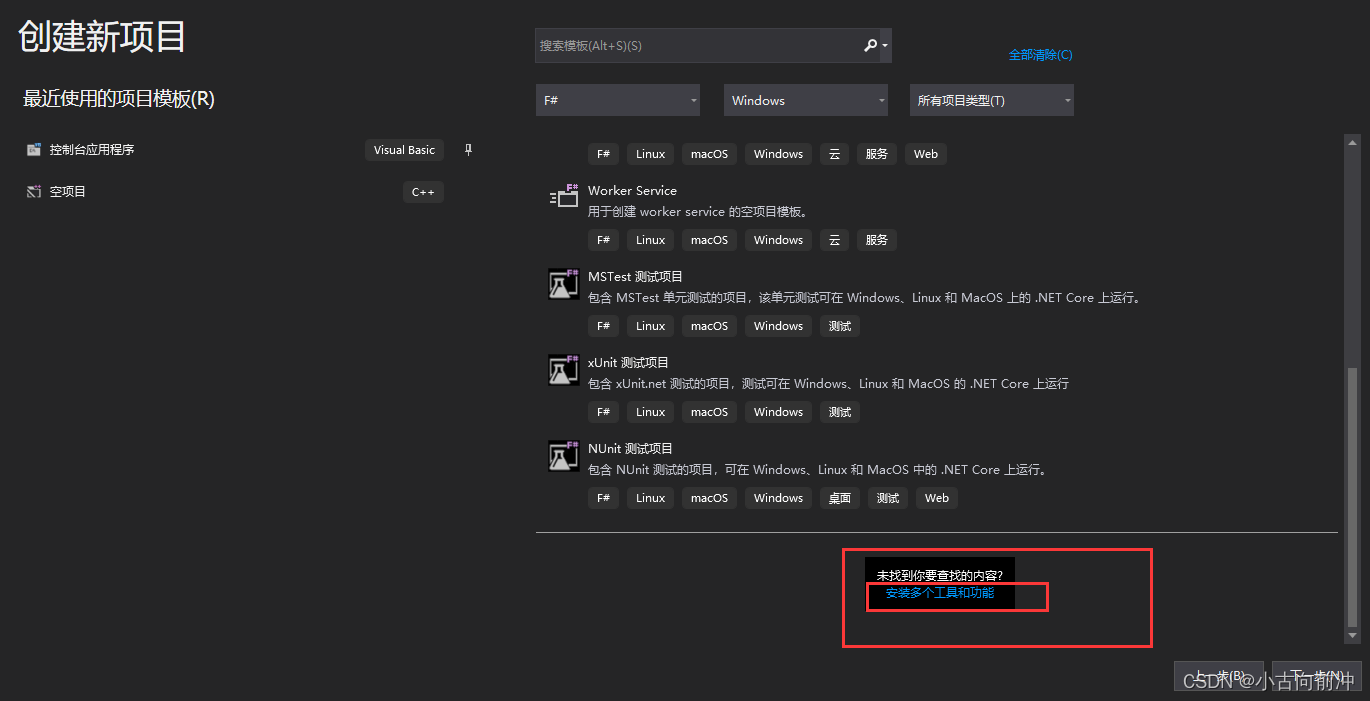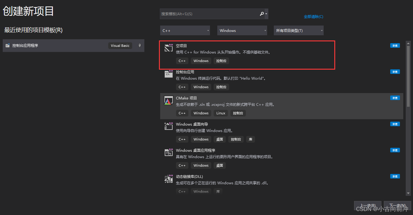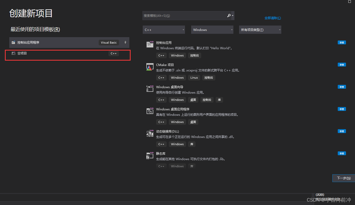 2.点击“空项目”如下图一,第一次打开会在右边列表如下图二。若此页面没有(若有略过后面)“空项目”则说明你的vs中没有支持c++的工具,此时点击“安装多个工具和功能”,选中“使用C++的桌面开发”后再点击“修改”按钮。