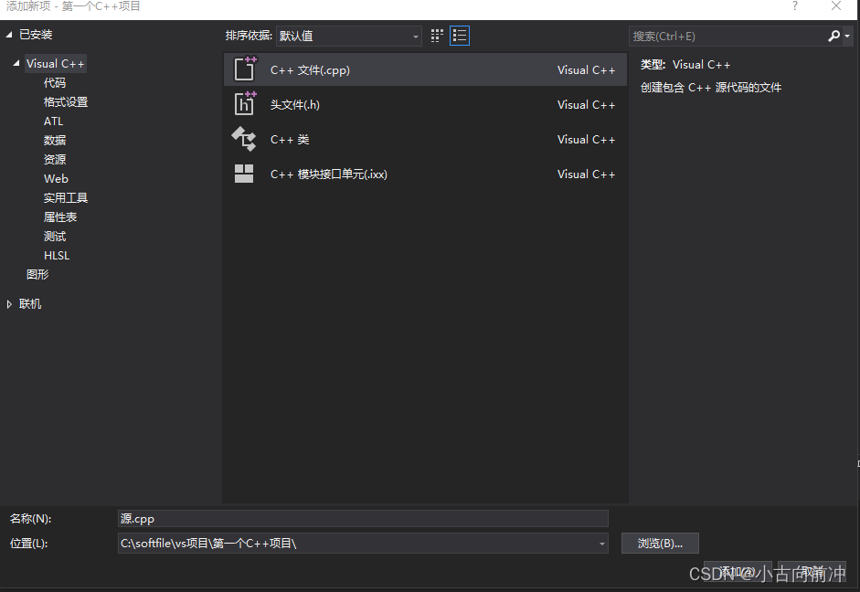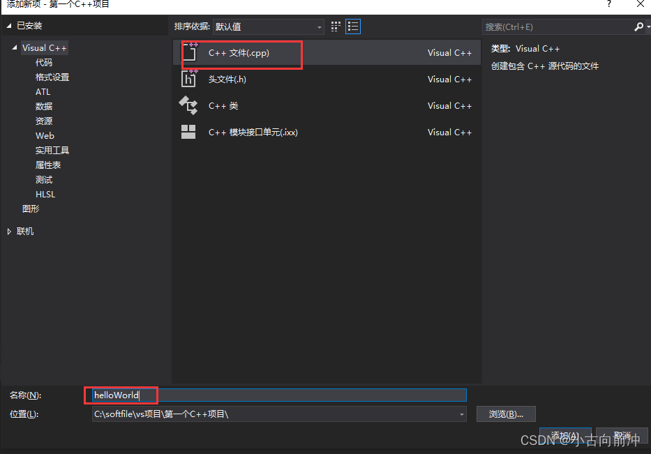 5.点击“C++文件(.cpp)”,输入程序名称,点击“添加”即可进行c++程序的编写