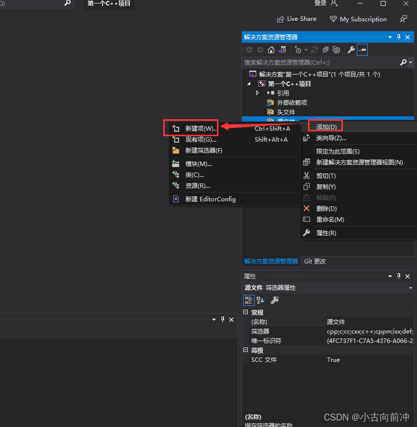 4.右击所创项目的源文件,依次点击“添加”、“新建项”