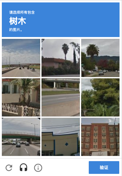 比如上面这张图,验证码页面会出现九张图片,同时最上方出现文字「树木」,我们需要点选下方九张图中出现「树木」的图片,点选完成之后,可能还会出现几张新的图片,我们需要再次完成点选,最后点击「验证」按钮即可完成验证。