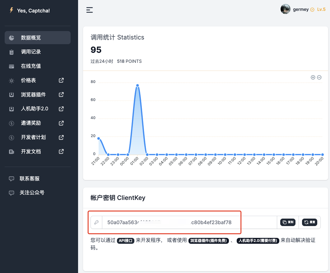 在使用之前我们需要先注册下这个网站,网站地址是 https://yescaptcha.com/i/CnZPBu,注册个账号之后大家可以在后台获取一个账户密钥,也就是 ClientKey,保存备用。