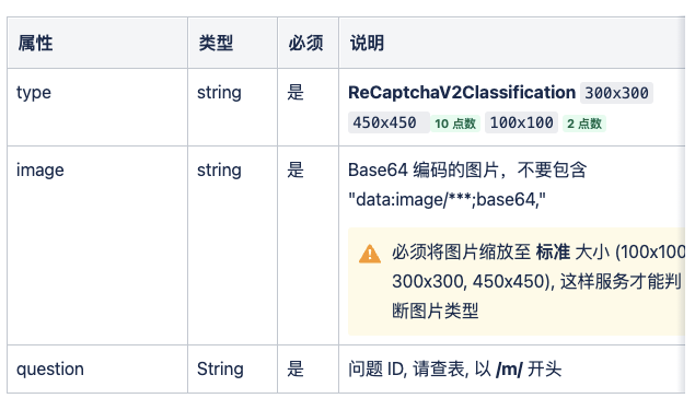 OK,然后我们可以查看下这里的官方文档:https://yescaptcha.atlassian.net/wiki/spaces/YESCAPTCHA/pages//ReCaptchaV2Classification+reCaptcha+V2,这里介绍介绍了一个 API,大致内容是这样的。