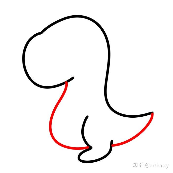 2、接着,我们画出它的小短腿和肚子。在刚刚画好的背部曲线下,也是由一条曲线构成它的腿,注意线条的弯曲程度。然后从面部下方画一条线连接腿和尾部,勾勒出恐龙的整体轮廓。