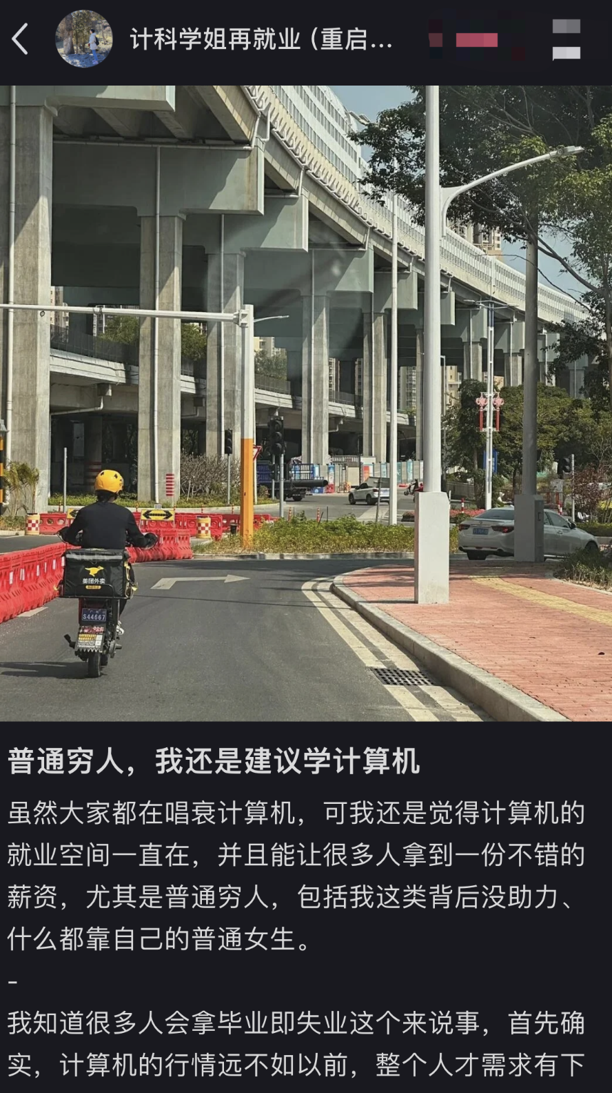 “对于家庭条件不好的人而言,计算机就和土木一样,是一门需要善于吃苦才能适应的专业,如果你足够努力,一定可以收获回报。因为你至少可以通过大公司的机试、笔试,证明自己有真才实学。而像金融、法律这些行业,你如果没有人脉和资源支撑,更难熬出头。”
