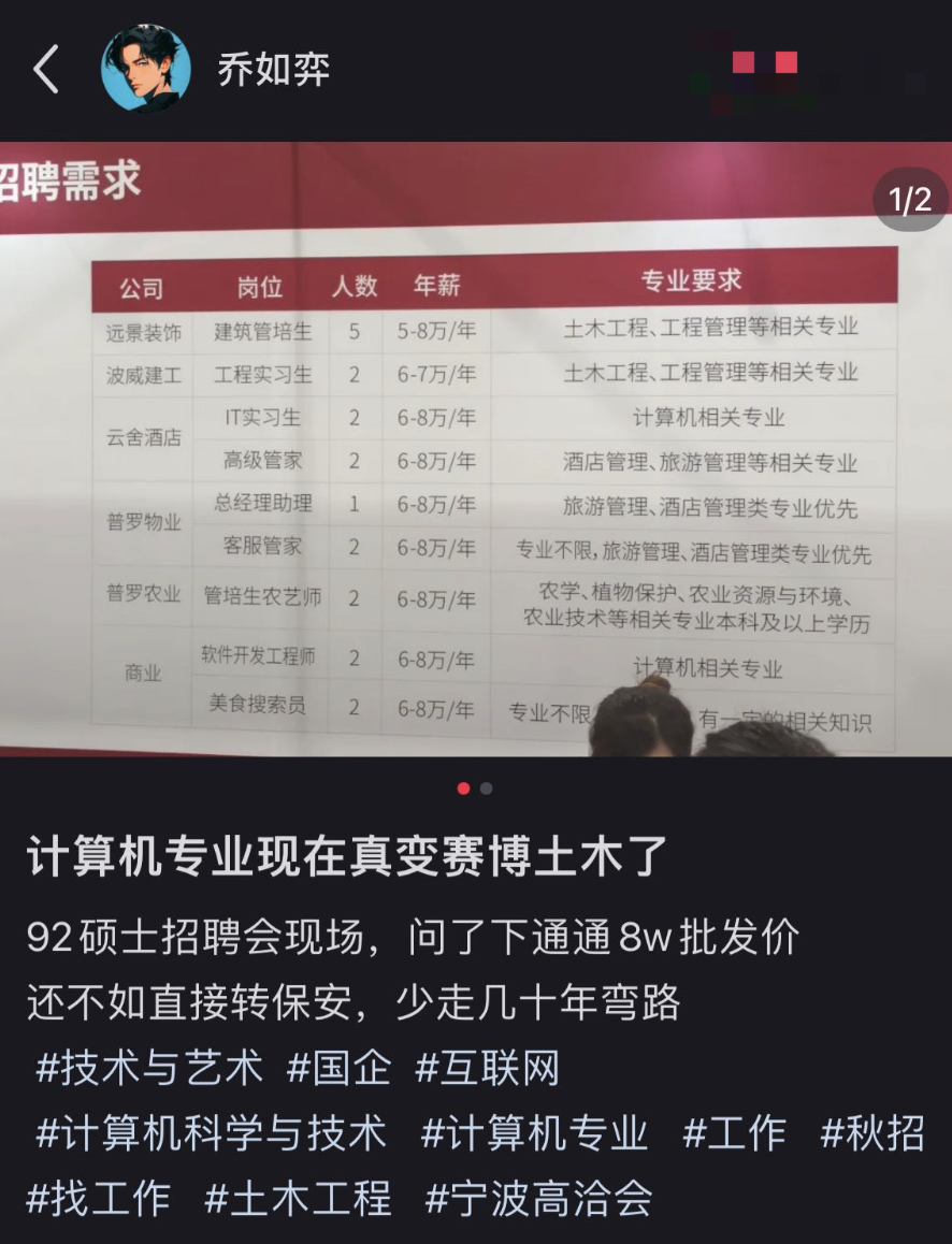 “大家毕业前的设想,是能靠一身技术成为科技新贵,年薪30w起步。结果进了人才市场,才发现非211、985学校的计算机硕士,年薪批发价平均只有8w左右。双非大学的毕业生,甚至只能去小公司干一些技术含量低、重复性极高的测试工作,约等于在拧赛博螺丝。”