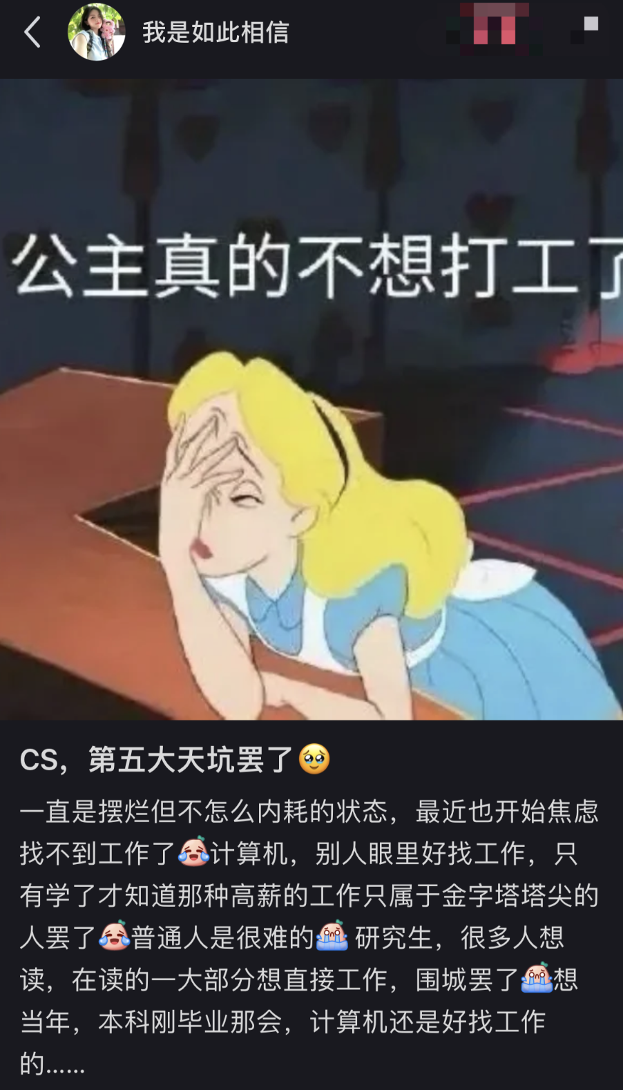 “问题是计算机学科的前沿资料,国内根本找不到。你得去查国外的论文,学习难度直线飙升,光是得花大量的精力去翻译就劝退了不少人。退一步说,即便你不想考研考博,计划先去小公司干活积累经验,然后再跳槽去大厂,现实里也很难达成。”