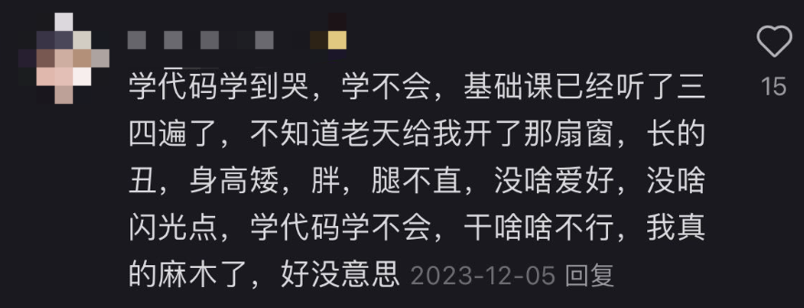 “如果你自身没有兴趣,那么每天都得盯着屏幕敲键盘,解决处理不完也没头绪的bug,绝对是一种心理和生理上的双重折磨。顶着这份压力还想成为行业内的佼佼者,难度不亚于考公。有这精力,你学别的专业肯定早混出头了,何必在一棵树上吊死。”
