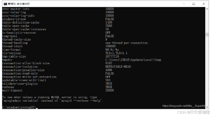 保存完之后以管理员身份运行cmd控制台输入mysqld –verbose –help验证是否有效,成功后出现下图(打印很长)
