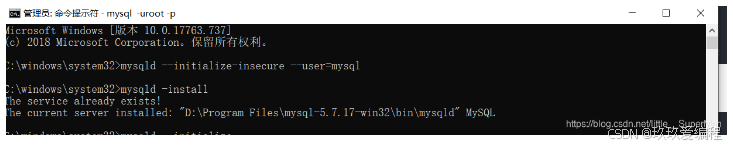 初始化完成后输入mysqld -install进行安装,出现 Service successfully installed 提示,说明安装成功。