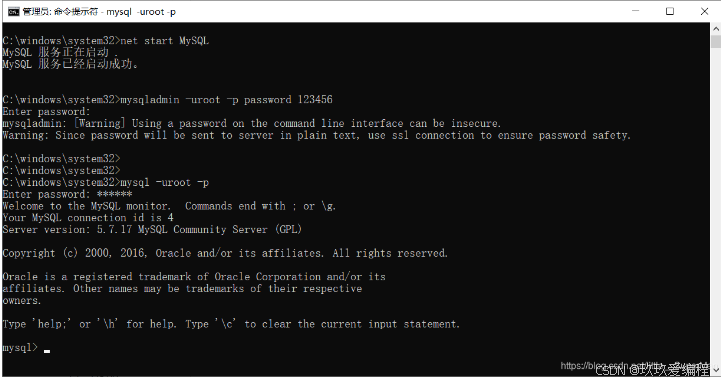 在设置完成后输入mysql -uroot -p尝试使用密码进行登录