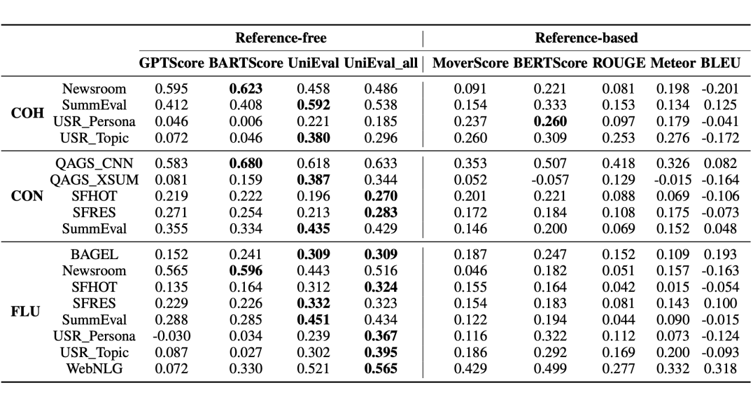 同时,评估 fluency 这类与 src 并不相关的指标时,为了降低 data-to-text 等任务中不常规 src 输入的影响,可以采用仅需要 hyp 作为输入的 method,例如 UniEva 对 fluency 的评估模式。