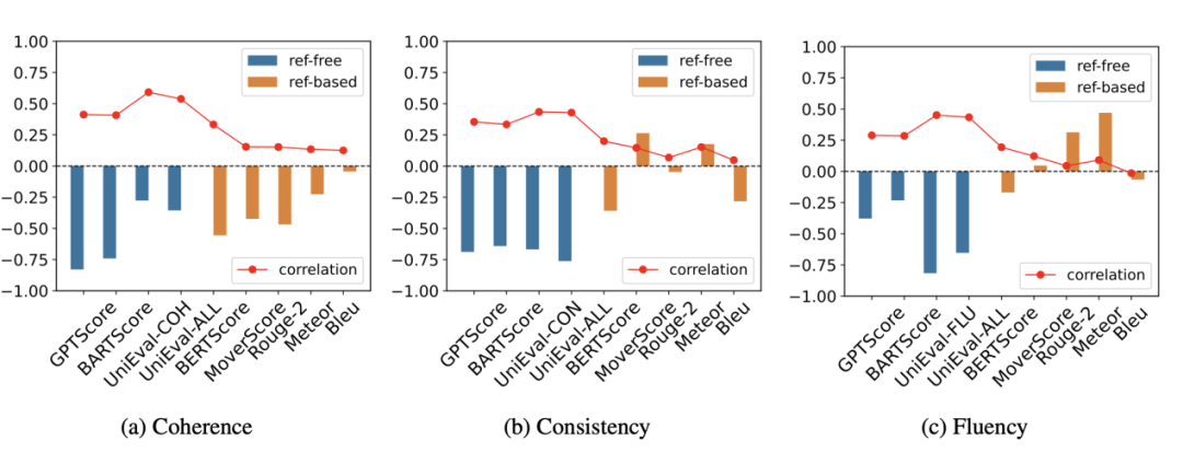 这说明,Ref-free metrics 对于质量较差的文本可以给出负面的评分,但是却无法对高质量文本做出正确的评估。至于 Ref-based Metrics,他们则没有一致的表现输出。考虑到原本便很低的相关性,这更像是一种随机的结果。