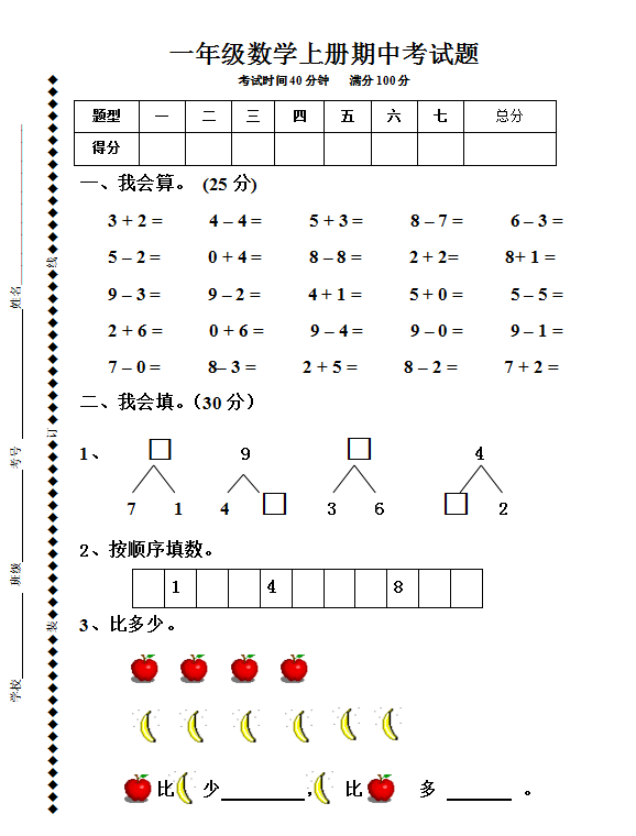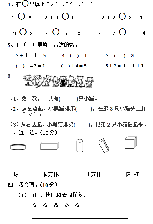 小学一年级数学第一学期期中质量检测卷