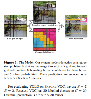 在本文中作者取S=7,B=2,C=20(因为PASCAL VOC有20个类别),每个bounding box具有5个参数,B个bounding box就是B*5个,同时要预测C个类别的概率,因此每个格子要预测的参数就是B*5 + C个,所以共有7*7*30个tensor(张量)。如下图。