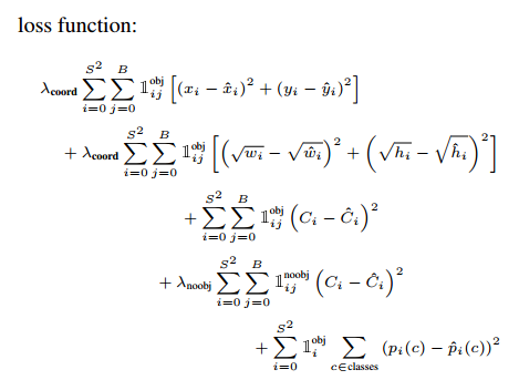 作者采用sum-squared error(损失总平方和)的方式把localization error(bounding box的坐标误差)和classificaton error整合在一起。如下图可以看出二者的权重不一致,如果不这样做,即8维的 localization error 和20维的 classification error 同等重要,这样显然是不合理的,另外因为很多grid cell是不包含物体的,这样的话很多grid cell的confidence score为0,这会导致网络不稳定甚至发散。