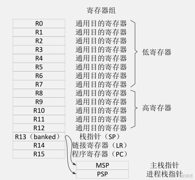 R0-R12:13个通用寄存器。其中 R0-R7为低端寄存器,可作为16位或32 位指令操作数,R8-R12为高端寄存器,只能用作32位操作数