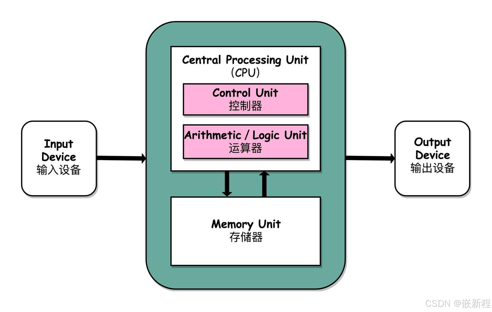 - 存储器:存放程序和数据的部件,也是计算机能够实现“存储程序控制”的基础。