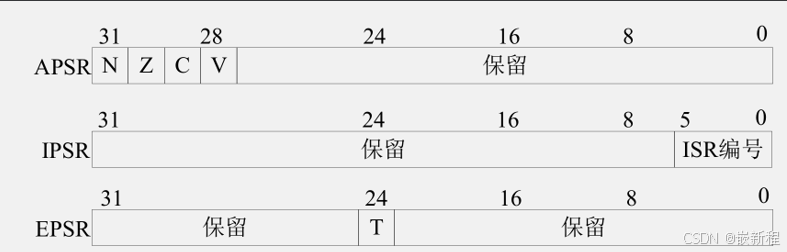 应用程序状态寄存器 (APSR):保存程序计算结果的状态标志 N负数标志 Z零标志 C进位借位标志 V溢出标志