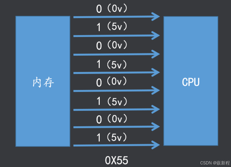 (3)每条传输线一次只能传输1位二进制数据。如: 8根数据线一次可传送一个8位二进制数据(即一个字节)。