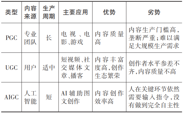 表2 PGC、UGC和AIGC的技术特征和应用对比