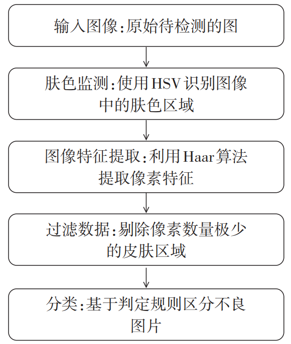 该实例的治理目标是对数字资源中的静态图片、动态音视频、生成式内容中的人物皮肤**情况进行自动识别,若检测到存在违规内容,则立即给出警示。该实例的风险甄别标准是根据颜色(肤色)找出图片中皮肤的区域,然后通过条件判断是否为违规内容。关键步骤如下:第一,遍历每个像素,检测像素颜色是否为肤色。第二,将相邻的肤色像素通过池化算法归为一个皮肤区域,得到若干个皮肤区域。第三,剔除像素数量极少的皮肤区域。同时,我们将非****的判定规则定义如下(满足任意一个判定即为真):一是皮肤区域的个数小于 3 个,二是皮肤区域的像素与图像所有像素的比值小于 15%,三是最大皮肤区域小于总皮肤面积的40%,四是皮肤区域数量超过50个。规则可以尝试更改,直到程序效果满意为止。基于肤色监测的皮肤**面积识别流程如图2所示。