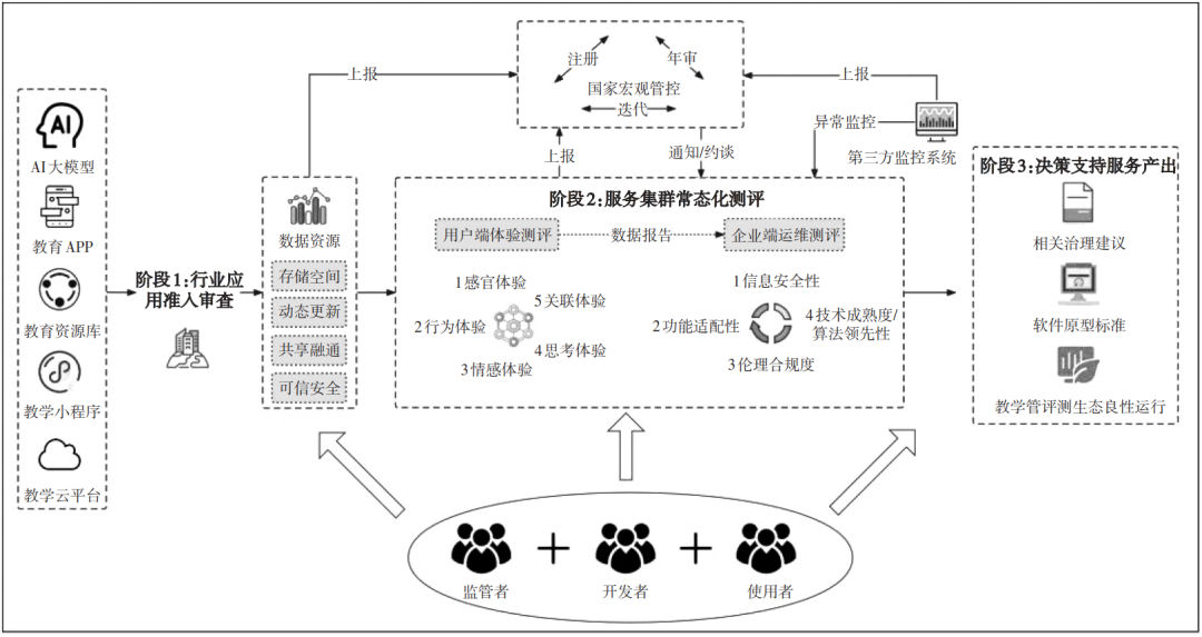 阶段二:服务集群常态化测评。以监管者授权的第三方机构检测、开发者自查和使用者监督相结合的形式实施。主要从用户端体验测评和企业端运维测评两方面开展,旨在形成“人员审查+社群举报+技术自查”的常态化监测体系,并能按照风险等级启动精准的治理策略。用户端体验测评主要涉及感官体验、行为体验、情感体验、思考体验和关联体验等;企业端运维测评主要包括信息安全性、功能适配性、伦理合规度、技术成熟度/算法领先性等方面,旨在促进数字教育产品的治理精准性,提高教育软件应用行业的运维成熟度。