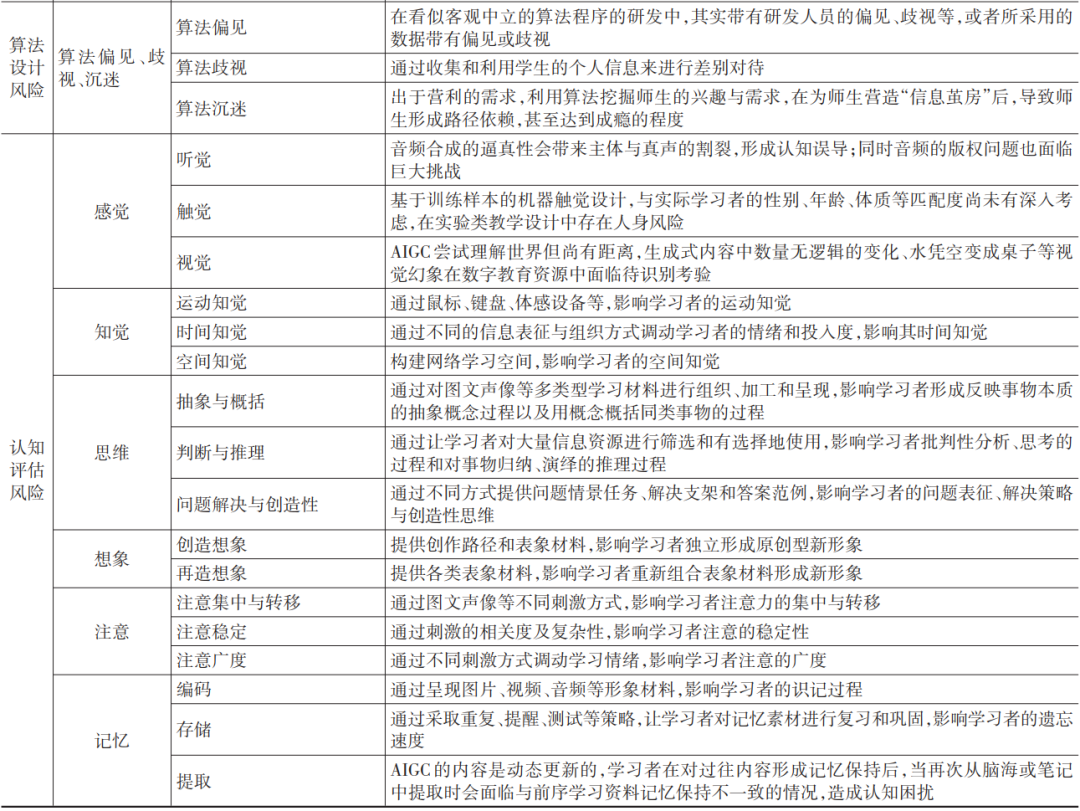 第一,教育算法缺位引发的认知偏差风险。商业利益裹挟的算法设计可能倾向于仅向用户推荐已经熟悉的领域,而忽视了可能对其有益的多样化内容,从而导致认知茧房效应。同时,算法设计者在内容生成设计时缺乏对学科内前序知识与接续内容足够的参数设置,由此导致学习者难以建立学科知识体系间的正确关联,从而影响其学科综合能力的培养。此外,算法设计在未能充分理解学习者个体差异性(如学科兴趣、学习风格、认知能力等)的前提下,更倾向于向学习者提供通用的教育内容,而无法满足不同学习者的个性化需求,由此亦增加了教育不公平的风险。因此,在纯商业算法导向和教育算法缺位的双重加持下,数字教育资源体现出学科知识呈现片面化和供给不适配的弊端,无法促进学习者的全面发展和个性化发展。因而,在AIGC越来越多地应用于教育领域的过程中,由教育算法缺位引发的认知偏差风险亟需引起学界的高度重视。