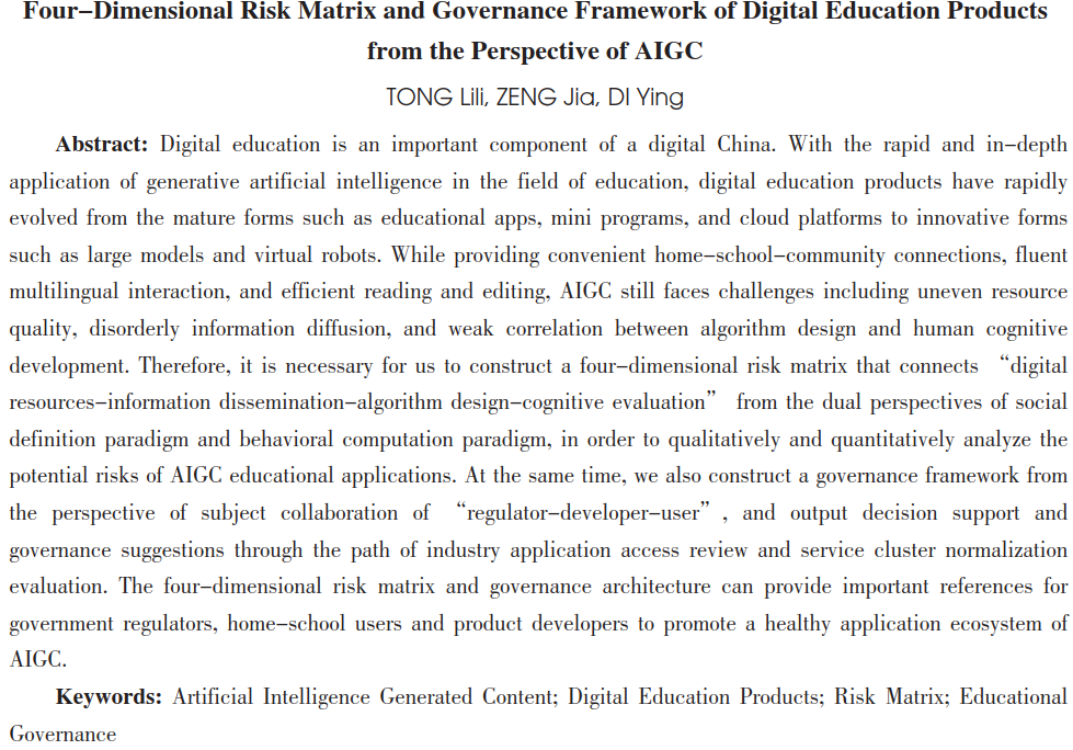 摘要:数字教育是数字中国的重要组成部分。随着生成式人工智能在教育领域的快速深入应用,数字教育产品已从教育APP、小程序、云平台等成熟形态迅速衍生出大模型、虚拟机器人等创新形态。AIGC在为教育提供便捷的家校社联系、多语种的流畅交互、高效率的阅读批改等技术红利的同时,仍然面临资源质量良莠不齐、信息无序扩散、算法设计与人的认知发展弱关联等挑战。为此,亟需从社会定义范式和行为计算范式的双重视角来构建一种贯通“数字资源—信息传播—算法设计—认知评估”的四维风险矩阵,以定性和定量分析AIGC教育应用的潜在风险。同时亦需从“监管者—开发者—使用者”的主体协同视角构建治理框架,通过行业应用准入审查和服务集群常态化测评的路径来输出决策支持和治理建议。该四维风险矩阵和治理架构可为政府监管者、家校使用者和产品开发者推进AIGC良性应用生态提供重要参考。
