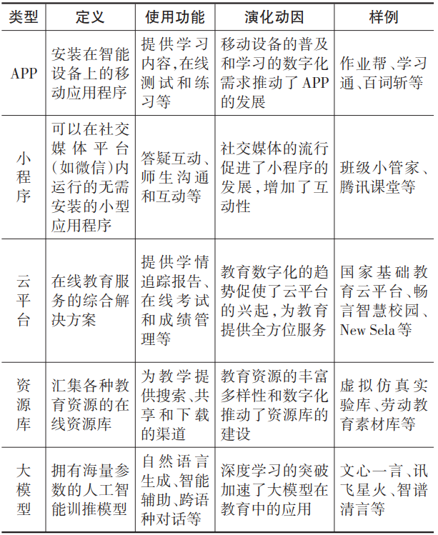 通过运用大数据和人工智能等核心数字技术,智能学伴、AI助教等个性实用的新应用模块正在演化成形态多样的数字教育产品。表1呈现了提供教育服务的APP、小程序、教学云平台、学科资源库、大模型等不同类型的数字教育产品的使用功能、演化动因等,揭示了智能技术对数字教育产品的变革与影响。学科或艺术素养类的教育APP使得时时可学、处处可学成为可能,学习者也能接触到比传统面授课堂更宽广的数字教育资源。班级小管家等小程序的使用,不仅有助于学校等组织较好地应对疫情等公共突发事件对学校正常教学带来的挑战,也有助于师生在实践中提升其数字素养。2023年进入全球公共测试的国际国内大模型,更是让人们体验了其优异的知识表现、流畅的语言交互和跨媒介输出等多项技术红利(何曼,2023)。